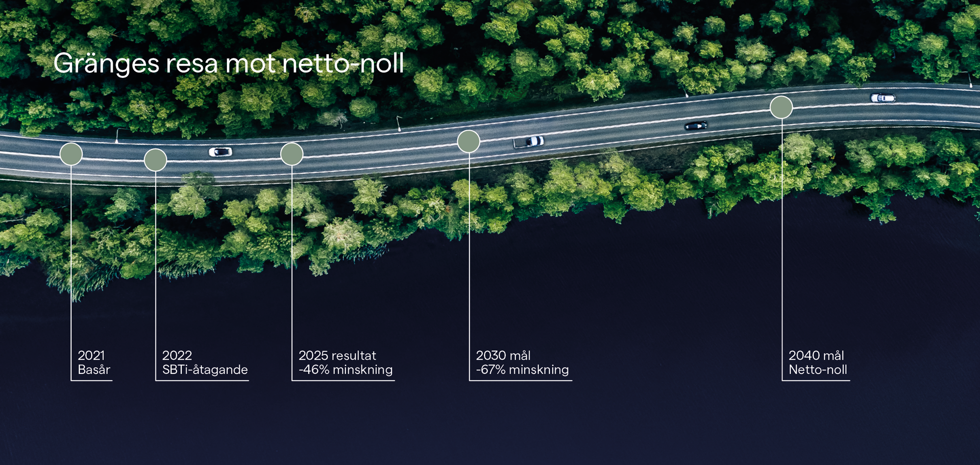 Aluminiumindustrin tillhör en sektor med utmanande klimatomställning och har en mycket energiintensiv produktionsprocess. Som tillverkare av valsade aluminiumprodukter uppstår Gränges största klimatpåverkan i värdekedjan, särskilt kopplat till inköp av metaller. Företaget har åtagit sig att uppnå netto-nollutsläpp av koldioxid till 2040, med ett mål på medellång sikt till 2030 för scope 1+2 och scope 3. Dessa mål har validerats av Science Based Targets initiative och är i linje med Parisavtalet.